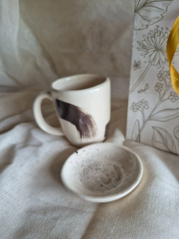 Regalo en bolsita especial con tarjetón y ramito de flores secar. Incluye taza pincelada en chocolate y posasaquito salpicado