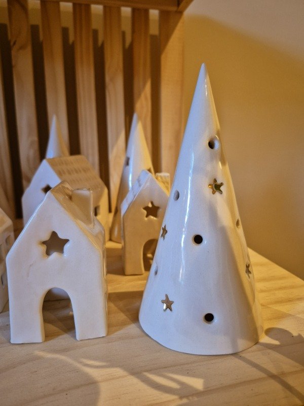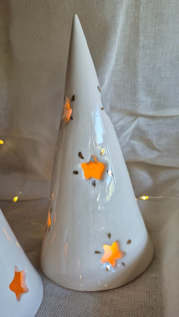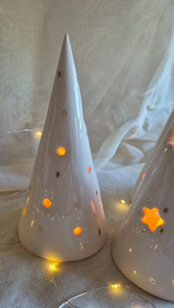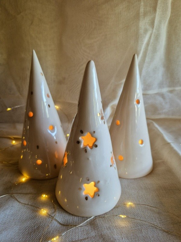 Pinos navideños ideales para usar con velitas led para que no calienten la pieza. De 18x9cm