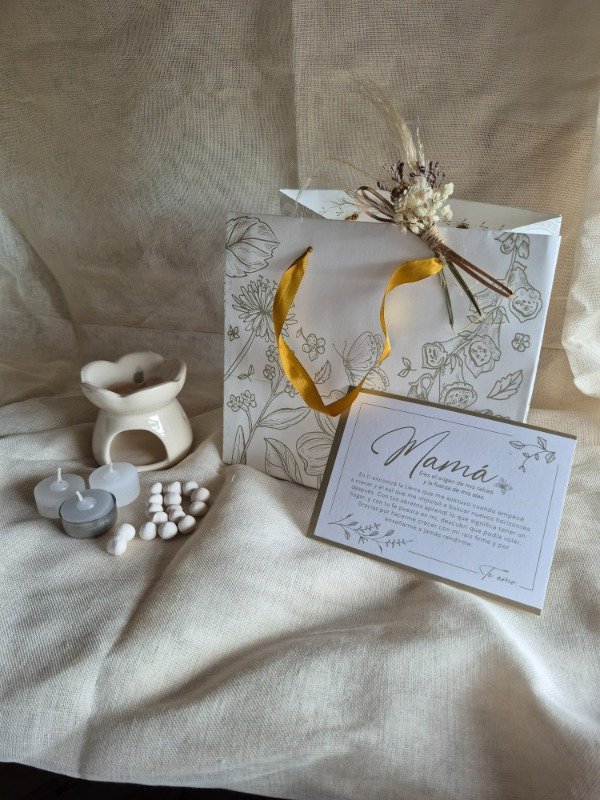 Regalo en bolsita especial con tarjetón y ramito de flores secar. Incluye hornito para esencias, 20 perlitas aromstizadas de flores blancas y 3 velitas de noche.
