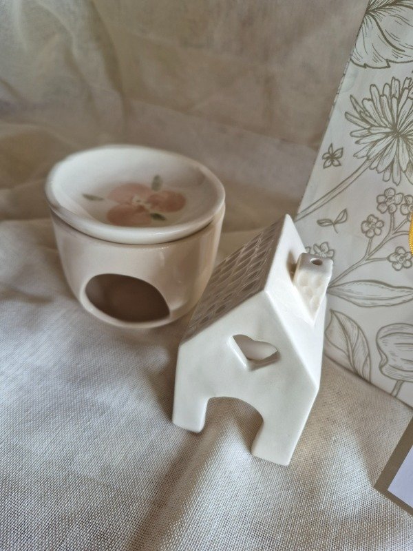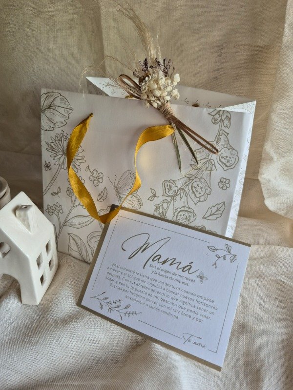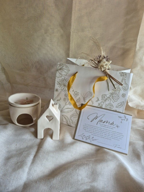 Regalo en bolsita especial con tarjetón y ramito de flores secar. Incluye casita luminaria y portasahumerio y hornito con platito
